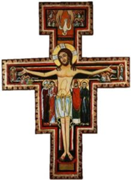 również krzyżem św. Franciszka. Jest wielce prawdopodobne, że krzyż w kościele św. Damiana zastępował w pewnym stopniu Najświętszy Sakrament, gdyż w ówczesnym czasie w małych kościołach i kaplicach nie prze- chowywało się Sanctissimum. Stanowił centralny element wyposażenia kościoła. Podczas wpatrywania się w krzyż Franciszek ujrzał poruszające się wargi Jezusa i usłyszał słowa: „Franciszku idź i odbuduj mój dom, który jak widzisz popada w ruinę”.